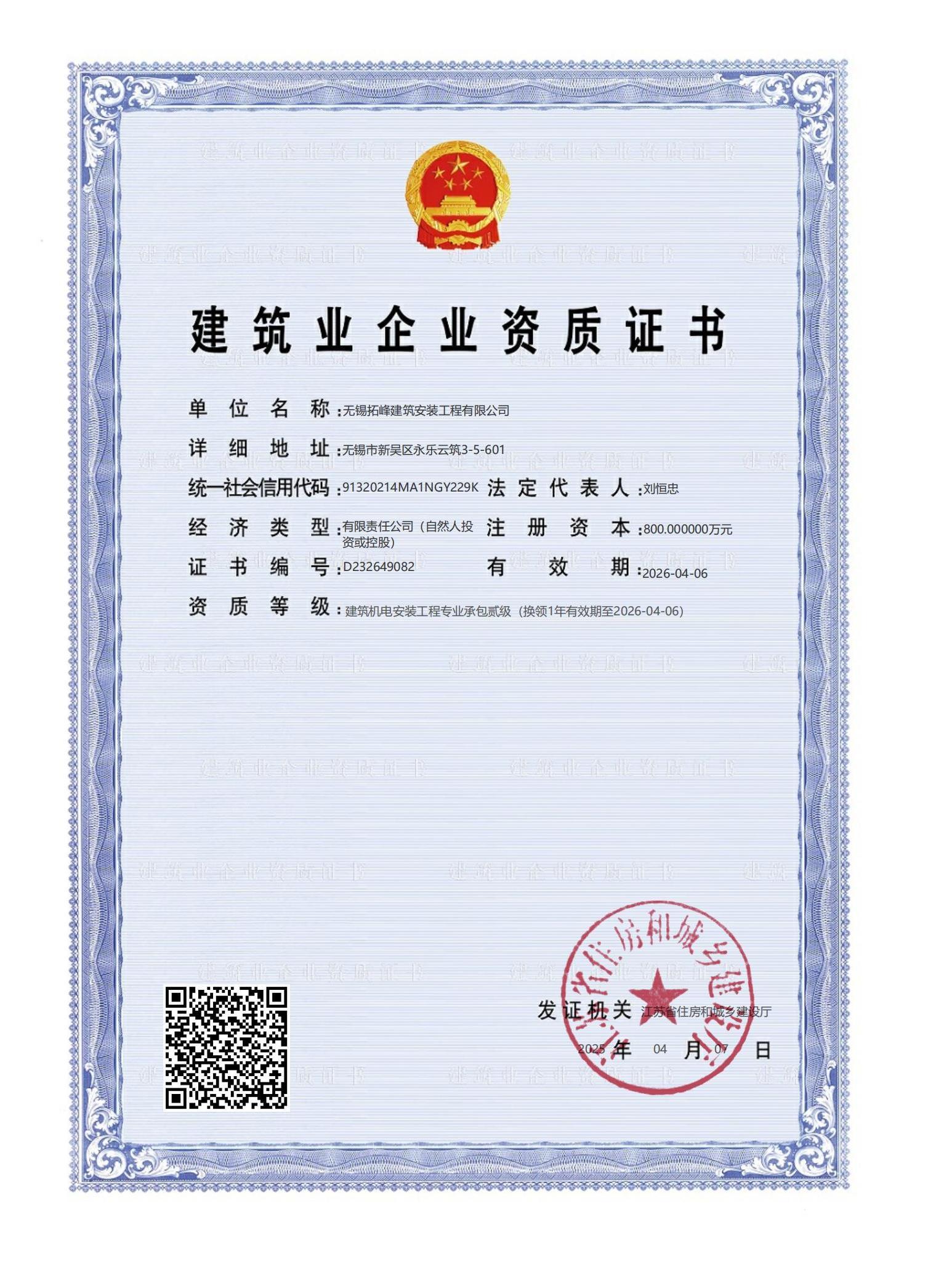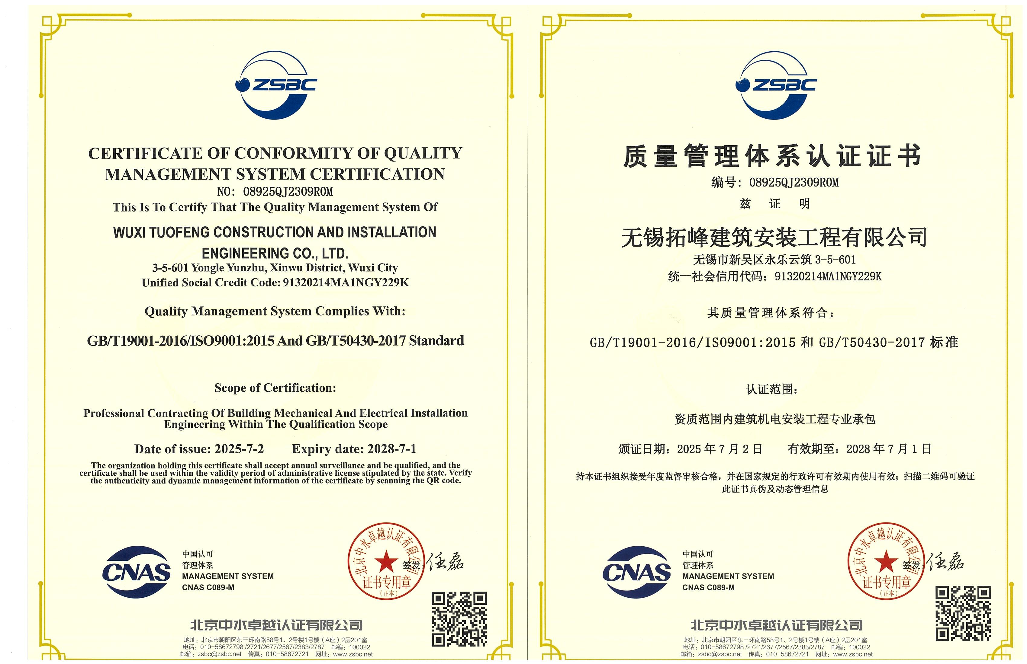 經過多年不懈努力與持續(xù)積累,公司現(xiàn)已取得“機電安裝貳級資質”,擁有“安全生產許可”,并通過了“ ISO9001”質量管理體系認證。
